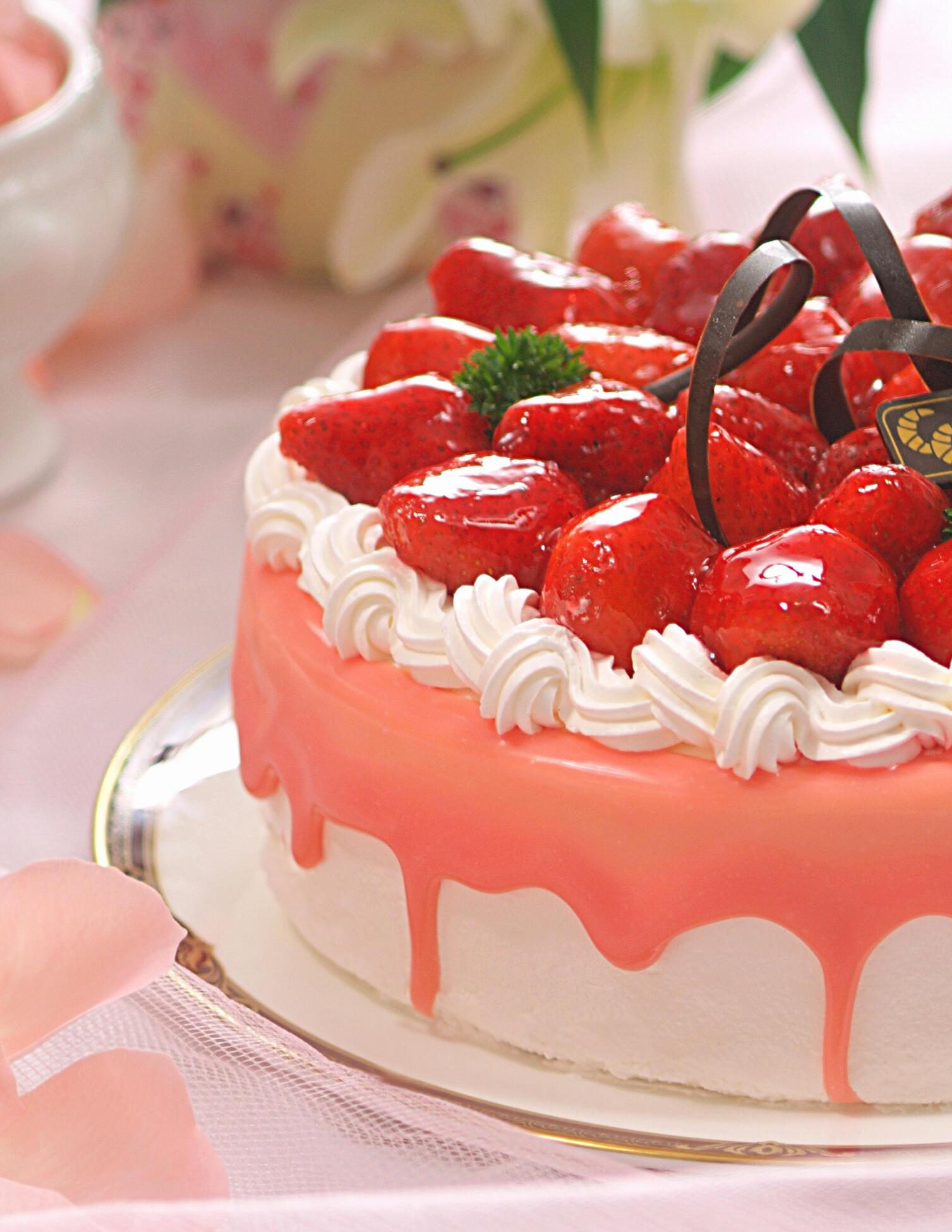 Tres-leches white cake filled with chopped pecans and strawberries, covered and decorated in a vanilla Chantilly cream, topped with regular and chocolate-covered strawberries and pecans.
