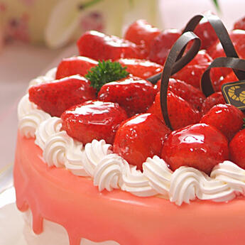 Tres-leches yellow cake filled with a medley of strawberries, kiwis, and peaches, covered and decorated in a vanilla Chantilly cream, topped with more of these fruits, pecans, and a chocolate-covered strawberry.