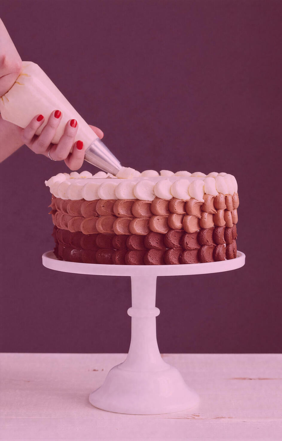 White cake filled with a layer of a mixed berry compote, covered in a vanilla Chantilly cream decorated with an assortment of berries.